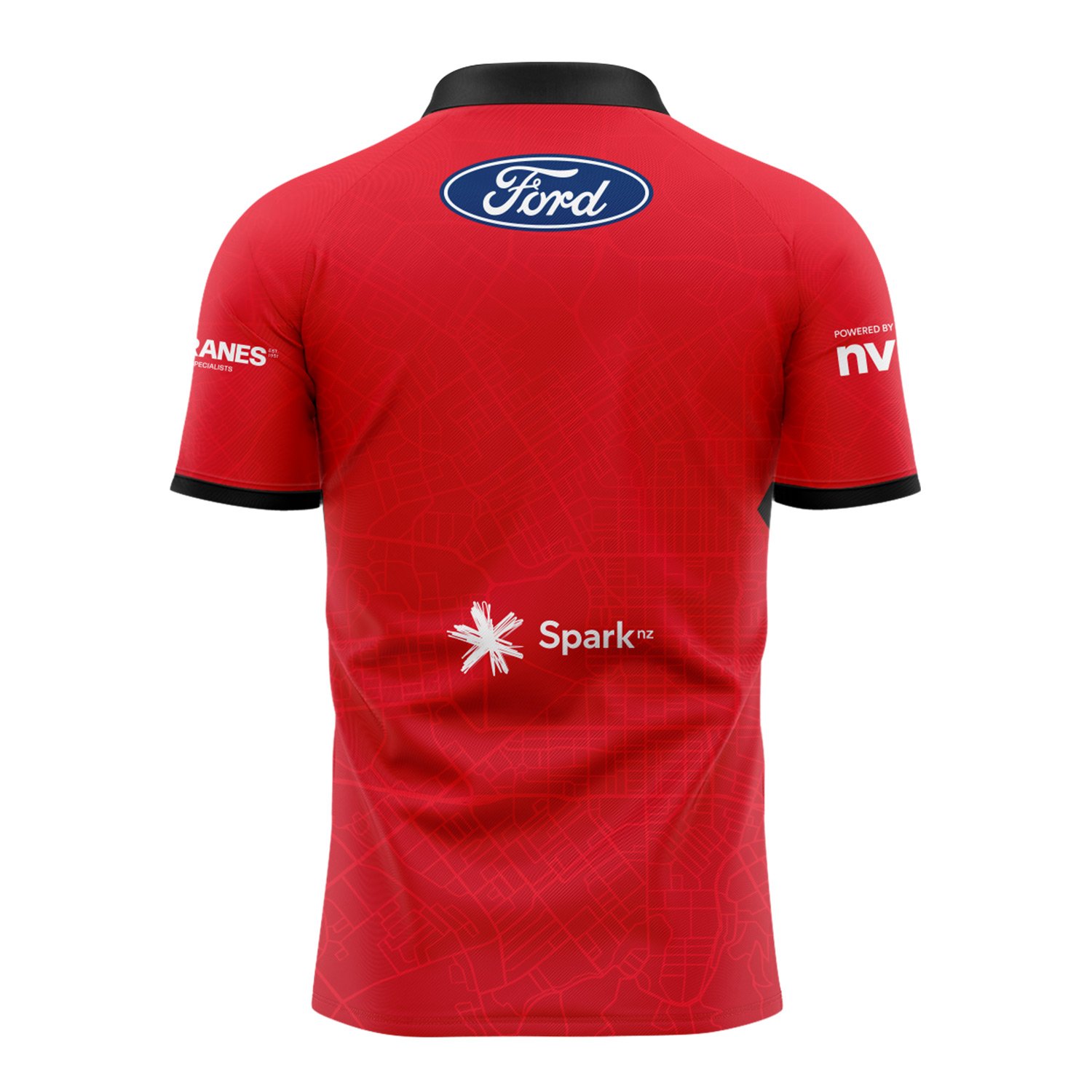 • Striking red design with tonal city-map detailing and authentic team branding.